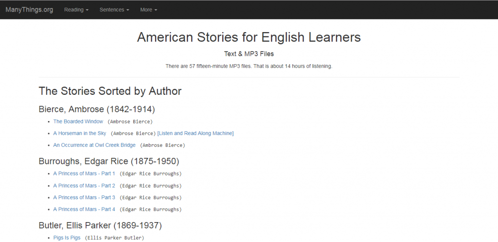 Một website kể và đọc các truyện của Mỹ giành riêng cho những người học tiếng Anh. Bạn muốn hiểu thêm về văn hóa Mỹ, cách người Mỹ suy nghĩ. Các câu chuyện ngắn chỉ kéo dài tầm 10’ sẽ cho bạn thời gian thư thái hoàn toàn khi nghe để ngấm giọng điệu/ ngữ điệu Mỹ trong khi bài đọc góp phần thúc đẩy kỹ năng đọc lướt và đọc tìm kiếm thông tin của bạn một cách tự nhiên nhất mà bạn không ngờ đế. Chưa kể, đọc qua truyện cũng là cách để bạn có thể học những câu trúc hoặc cách dùng từ đầy ẩn ý của người Mỹ nữa đấy.