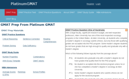 Với Platinum GMAT, bạn có thể chọn làm những câu hỏi riêng lẻ hoặc làm full test. Điểm thuận tiện nhất của website này là bạn có thể lưu lại lịch sử các tets hay câu hỏi ngắn đã làm, và tiếp tục làm trong các lần tiếp theo. Bên cạnh GMAT, bạn còn có thể tim thấy các thông tin hữu ích về MBA tại đây. Nhìn chung, với mức giá free thì Platinum GMAT là địa chỉ tuyệt vời đối với những người muốn chinh phục kỳ thi này.