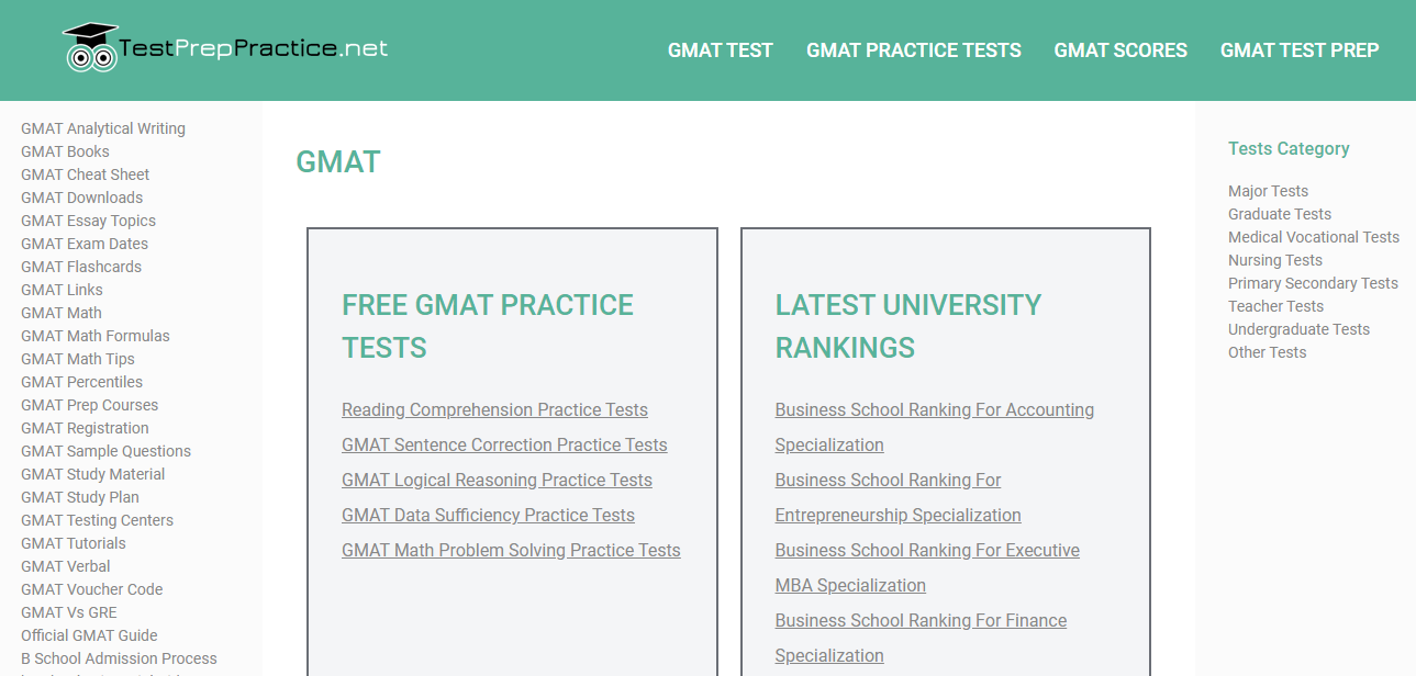 Nếu luyện thi GMAT, đây là trang web không thể bỏ qua. Các khóa học này có cả chương trình học online, các bài test chất lượng , …. Mục Prep Courses hay Prep Classes cung cấp review về các khóa học GMAT uy tín trên toàn thế giới. Bên cạnh đó, Test Prep Practice đưa ra danh sách một số đầu sách học GMAT ,link thẳng đến website Amazon. Test Prep Practice tạo forum trao đổi những thông tin hay kinh nghiệm về kỳ thi GMAT.